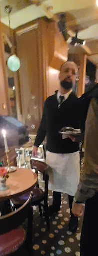 This was a stop on the way back to our hotel & it was dinner time so of course I didn't bother with reviews. The only reason this restaurant gets 2 stars is for the atmosphere. Very cozy, romantique & Gatsby-like. Our waiter (pictured) was nice until I ordered water. My husband took his suggestion on this horrible beer, but we didnt say anything. The food was ok. We had a dry croque monsieur & fr onion soup...which was good (Not Au Pied du Cuchon level, but decent). Their prices were decent as well. However, the waiter did it in for us. We were sitting right by the ext door when he had another table outside & slammed it open hitting the wall just behind me. It was extremely rude. Then, he had nerve to insist we tip! His tip was alrdy included and he did just the opposite of deserving a tip. Look, we dont speak french but tried. I cant have carbonation, so yes, water. We're at the end of our trip & this is the 1st rude waiter. I think waiters like this shouldnt be in the srvc industry, especially in 1 of the largest tourist capitals of the world. Sounds like management should get...