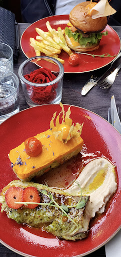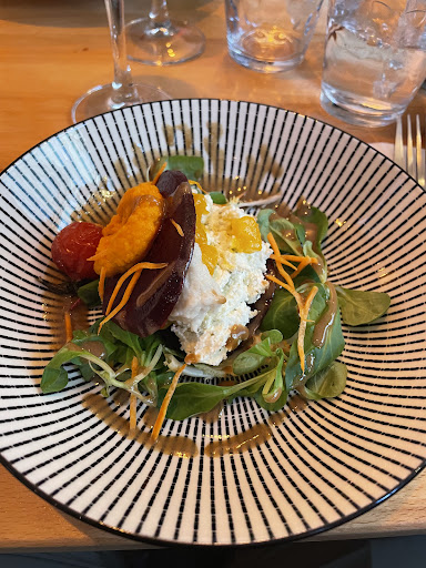 Josef is the sole chef; he both cooks and, along with a staff of one, waits on tables when he can. He is a culinary artist, who turns out dishes that look like modern works of art in their color and composition (think: a mix of Mondrian and Klee). His canvas is the plate upon which he composes, with fresh and organic food, culinary delights that provoke one’s sight, smell, and taste.