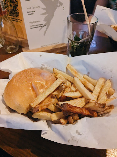Nous avons également commandé un burger frites (apparemment fait dans une enseigne voisine d'après l'un des habitués qui était là ce soir-là). Les frites étaient bonnes, le pain délicieux et la composition sympathique (steak oignons caramélisés cheddar chorizo salade tomate et sauce burger). On a une impression de pas assez par contre, alors que le plat est à une quinzaine d'euros et que je n'ai pas un grand appétit non plus.