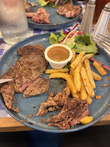 Just had meal here. Food ok but no better than average French fayre. Onion soup a bit watery and lacking in full flavour. Cheap cut of steak on set menu pleasant enough and moules a la creme reasonably good - all with proper homemade frites which were good. Staff very keen to usher tourists in but once seated they neglected to bring us an ice bucket for the already tepid white wine - and also forget the tap water once we'd turned down the offer of buying the bottled stuff. Also be careful not to be deceived by the menu outside which shows the menu du jour with additions that don't appear on the printed menu inside - and the full menu that is so prominently displayed is actually for takeaways only so once you get in you realise that the prices in the restaurant are actually almost double. When the bill appeared we also got charged extra for not ordering dessert at the same time as other courses off the set menu so chocolate mousse was charged at 8€90 instead of €3!! And when this was pointed out the waiter simply shrugged and said the set menu had to be ordered all together to get the fixed price. A free shot of limoncello didn't quite make up for it - so needless to say they didn't get a tip. Oh and I almost forgot - we also had a visit from a mouse scuttling under our table half way through the meal! Overall not...