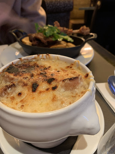 We ordered the escargot, a staple food in France, french onion soup for me, and the duck confit for my friends. We loved the escargot. As tourists, we were surprised by the pesto sauce it was cooked in. However, we were really excited to eat famous french foods. The snails tasted great and was a great appetizer. My soup came out quickly and was topped heavily with cheese (def not complaining!). I never ordered this before in America and didn't know what to expect, but loved it. It was a bit salty, but loved the bits of bread they put in. My friends' duck was unfortunately really dry. The piece was pretty small as well. The potatoes that came with it was really good though.