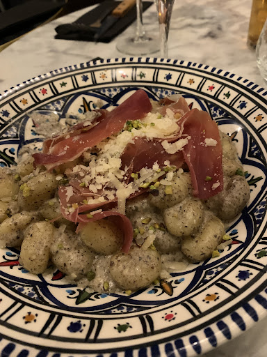La prise de la commande se passe très bien. Les plats mettent du temps à arriver. Les employés servant les pizzas ne connaissent pas non plus les numéros des tables et peinent à associer la bonne pizza à la bonne table. En descendant les escaliers, l'employé a par ailleurs fait glisser les pizzas : ma pizza s'est donc retrouvée sur la pizza de mon convive. Je me rends compte que la pizza qui m'est servie n'est pas celle commandée : elle repart donc en cuisine. On me ressert la même pizza, avec les toppings supplémentaires : burrata, pistaches et mortadelle, notamment. Les pizzas sont très très bonnes : la pâte de la pizza est très bien travaillée et extrêmement moelleuse. Les quantités sont généreuses, on peine à terminer les pizzas. Les tranches de mortadelle sont un peu épaisses. Les fromages présent sur la pizzas 4 fromages sont délicieux.