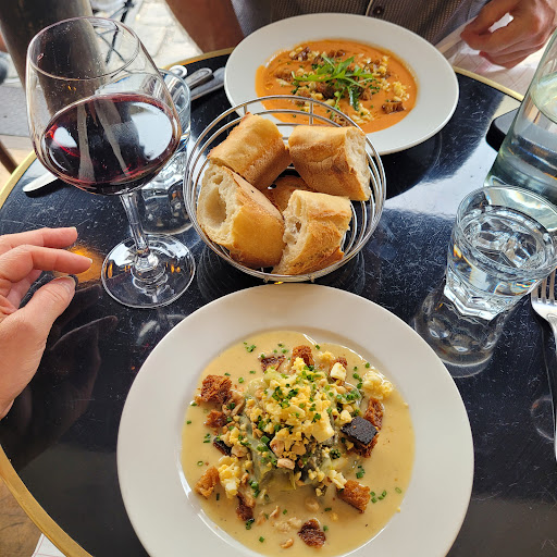 To start, we shared two cold appetizers—a gazpacho and a country terrine—along with a bread basket. My husband enjoyed his gazpacho, and the terrine had good flavor. For mains, I ordered the steak with pepper sauce, while my husband chose the sea bream with vegetables. He found the fish delicious, with crispy skin and well-prepared vegetables. My steak, however, was tough. I skipped the accompanying sauce since it contained foie gras, so perhaps that would have helped. The mashed potatoes on the side were good, though not particularly inventive.