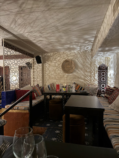 Great venue, beautiful vaulted ceilings with lots of space. Very tasty food, excellent bread, though portions are on the smaller side. Seating area full of lamps, a wall covered in maps; very busy on a Friday evening. After dinner you can head downstairs, where a DJ is playing. Many young people, though the dance floor is a bit inconvenient due to the many pillars.