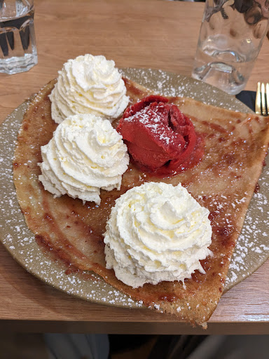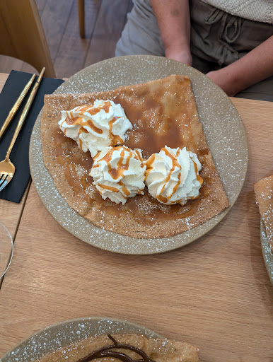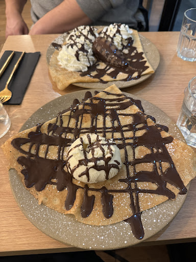 The crepes are good, the vibe is terrible though, no music at all, poor decoration and Deliveroo drivers banging on the windows while the staff prepares delivery bag right next to where people eat… they have a little workshop going on, you can hear tape being used as well as paper bags being folded etc. It’s like eating in a warehouse basically. There are better options in the neighborhood. The waiter we had last time, a dude with long ish dark hair, young, was not particularly welcoming, or polite, we felt we were bothering him and preventing him from watching more tik tok on his chair by the bathroom. Odd, I won’t go back, despite living 30 seconds...