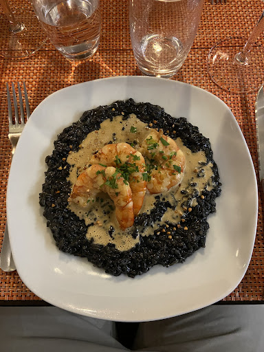 (++) Gambas rôties, risotto à l’encre de seiche, jus parfumé aux crustacés. Ce plat est présenté comme le plat signature du restaurant. Le risotto est particulièrement réussi, crémeux, bien beurré (et sans fromage) sur lequel sont présentées les 4 gambas décortiqués arrosé de jus. De petites graines de sésame torréfiées se trouvent dans le risotto. C’est indéniablement un bon plat goûteux que je mangerai de nouveau avec plaisir.