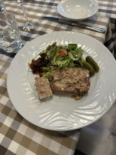 Cozy restaurant offering traditional cuisine in a wood-paneled interior with colorful murals.