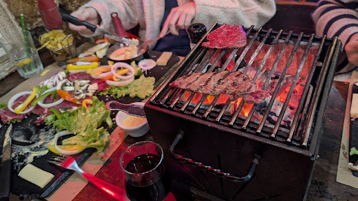 The experience was as engaging as it was delicious, with a charcoal grill placed right on the table, small fry pans for melting the delicious cheeses, and an impressive variety of high-quality meats, mushrooms, and fresh vegetables to accompany it. For those wanting an even more indulgent experience, you can order an entire full piece of cheese to melt at your table, adding a touch of spectacle to the meal. The food was truly fantastic, and to our delight, my daughter, who has celiac, was able to enjoy everything except for the bread.