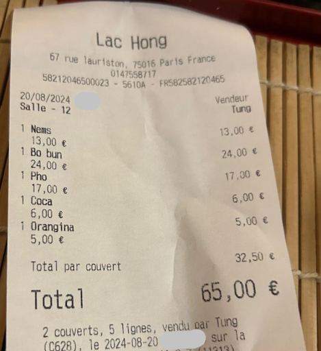 Read moreVery disappointing! I found this restaurant through google, listed as nr 1 place for Pho. I even made a detour just to eat here but regret it deeply. Why was it so disappointing? The restaurant only opens at 7pm. Even though the owner saw us waiting in the pouring rain at 6:45 pm, he didn't bother letting us in. The Pho I ordered for my son of 10 was a rather small portion compared to what i am used to in California, or even in the 13th arrondissement in Paris. Also the Pho is very strong, too much star anise in my opinion. The Bo Bun i ordered for myself tasted sour; I don't know why they needed to add pickled cabbage to it. The nems (spring rolls) were chewy and small. I didn't like it that they served the Pho first and the Bo Bun came only 5 min later. I thought it was just us, but some French people at another table 'complained' about it, when their dishes weren't served at the same time. The service is extremely slow. We waited almost 30 min (when we ordered, there was only 1 other table occupied; later more people came in) 7.The price was 2 times higher than what I usually pay in the 13th arrondissement (see picture of receipt) A simple tip for anyone who wants to eat at a good authentic asian restaurant: check if there are any asian customers. This restaurant had mostly non-asian customers. Last but not least: the owner came to us afterwards to ask where we are from and also to beg us to write a good review. Felt very awkward and sad.