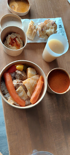 Read moreCantine de quartier. Les mets (entrée : houmous, salade de beterrave... - plats : mafé, couscous, yassa... - desserts : gâteau, salade de fruits....) sont faits maison avec des produits frais et préparés par les habitant.e.s du quartier de Rosa Parks. Le mafé était très bon (encore meilleur avec le piment). Neanmoins, nous sommes trois à avoir eu un os en guise de viande au lieu d'un vrai morceau de veau ! Vraiment dommage. Quantités correct même si on aurait aimé en avoir un peu plus. Le fondant au chocolat est à revoir !