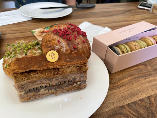 Read moreDelicious viennoiseries pastries. A newer take on the traditional croissant: one with a sweet glaze and a cream filling. RASPBERRY ROSE LYCHEE "ISPAHAN" CROISSANT. Another variation of the pain au Chocolat … pain au chocolat et pistache… glazed with dried/roasted pistachio and a cream pistachio filling as well on top of the chocolate 😳 and lastly 2000 feuilles (twice the amount of layers) 😂 . Oops forgot the macarons… Yes it was an indulgence. A little on the sweet side, so definitely find someone or a few people to share these...