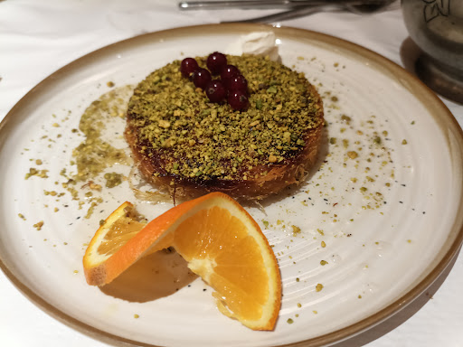 1- really good atmosphere, you can feel some privacy 2- the entry is good but a bit expensive (22€). 3- the main plates were delicious but it is not enough to be full. 4- the araki is authentic and turkish, but again a bit expensive (9€) for 4cl. 5- kunaife: the last time i bought from that place was really good. This time was not good, no cheese inside it and the upper layer is somehow burned and hard. Overall, for 75€ you can have a good turkish experience...