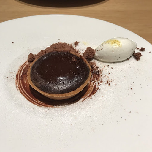 oyster amuse bouche: very fresh tasting sashimi: also tasted very fresh, but a little rough and hard to chew; the white stuff, which I believe was solid olive oil, was very interesting shrimp and scallop: lightly stir fried, tasted very fresh fried octopus: my boyfriend got a creamy mushroom soup that he could not stop raving about, and I got this instead because of my lactose intolerance. The tempura was light and excellent. fish with rice: good but the lemon sauce was too strong and did not quite go with the dish steak: this was the worst dish; the meat was really tough chocolate tart: my favorite course! It was wonderfully rich with great contrast between the warm tart, the cold chocolate powder stuff, and the vanilla bean ice cream. I loved this.