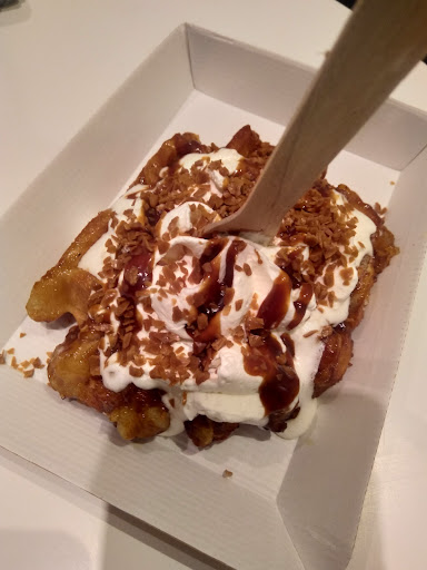 On y trouve des gaufres à toutes les sauces, aussi bien natures qu'au chocolat belge, à la crème chantilly, au camarel beurre salé, au spéculoos, etc. Le choix est varié et la gaufre est grande. Je me suis donc contenté d'une seule gaufre, celle au chocolat belge. La gaufre est cuite en direct devant nous par le très sympathique gaufrier.
