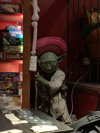 Vibe was fantastic--the clientele had energy, and some people were playing board games (not Monopoly, but the contemporary hobby board games like Ticket to Ride, Smash Up, etc.), while others were just having a drink and chatting enthusiastically. Our mood immediately perked up. The menu was fun, laid out like a newspaper called The Kraken Tribune, and each item had its own little quirky slogan. We ordered drinks and food and checked out the extensive gaming bookshelves.