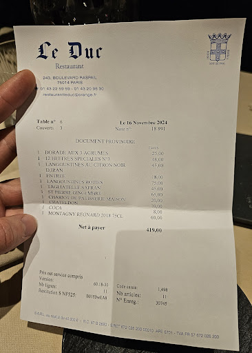 I had the sea bass with garlic toast. Very light but primed the palate. I followed with Sole meunière. My wife Amy enjoyed the langostine tartare with Iranian loomi and followed with the lobster in orange butter sauce. Photos of the mains are attached. Desert was mixed fruit and cappuccino.