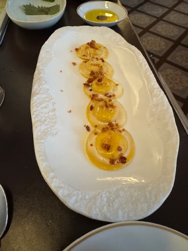Read moreThis Michelin rated restaurant is located in the Four Seasons Hotel. We were sat right at the entrance of the restaurant. I really hate sitting at the entrance as it is the busiest and it is distracting from the experience of eating. I should have asked to be moved further back into the restaurant which is beautiful. They give you little chairs for your bags. The waiter was really nice. We ordered the tasting menu and there were two selections so we decided to choose both options so we could try everything. The free item they gave us was the fried mini shrimps. Very good! Already love the first dish, was excited to try the rest. The flat bread stock they gave was also tasty. The first thing they brought over after was the pumpkin soup. It was good. Better with each sip. Noticed that I liked it more and more as I sipped it. Next was a crab cake. Fantastic! So good! Next was both tuna dishes. One was tartare on top of a fried thing that resembles tater tots. I normally don’t like raw stuff but it was ok. Didn’t want to finish it because I was trying to leave room for other things. The other tuna fish had mushrooms and some other flavors which were also interesting to me. Like it too. We didn’t like one of the pasta dishes as it had cheese in it. Maybe you would like it. But it isn’t my cup of tea. Love the other one though. Very tasty! Next was the veal chop which had some fried breading. Very tender. Not my favorite. The seated sea bass was delicious. So crispy! Next to last dish was a cheese dish, no! Don’t like cheese. So you might like it. The dessert was really good! It is a mix of cake and sorbet! There were tiny fish eggs that pop in your mouth. On the bottom was a layer of chocolate. Great experience! Took about 2 hours to finish. Would...