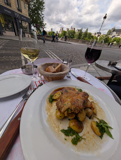 Yesterday I returned with my partner. Our first day of arriving so we were looking for a sure thing. I took my partner here. We sat outside looking out onto the greenery of the Seine River. We order the cheese plate and the chicken as our main. I had a couple of glasses of Chablis while my partner had a lager to start and then a glass of Pinot noir. The food was just what we needed. Fresh and delicious! We absolutely looooved the cheese plate variety!