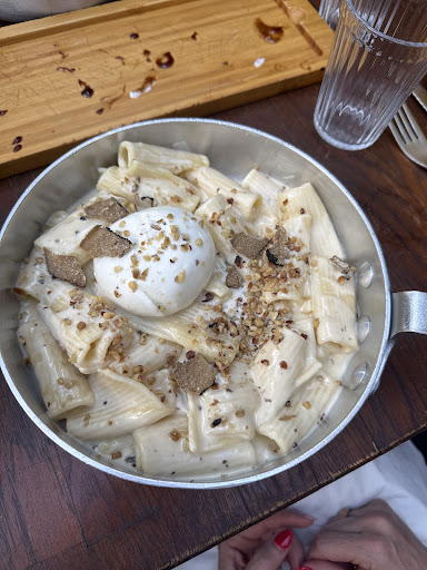 Read moreCherchant un restaurant autour de la Madeleine, nous sommes tombés sur celui-ci. Consultant les avis sur Google, nous sommes confortés dans notre choix et donc réservation est faite. Dès l’accueil, nous aurions dû comprendre que cela n’allait pas aller. Accueil dédaigneux, peu sympathique. Nous prenons place à table et commençons à regarder la carte. En guise d’apéritif, vu que nous sommes dans la cuisine italienne, nous optons pour un Prosecco. Des minutes passent et toujours rien… finalement nous supposons, le gérant vient fouiller dans les combles derrière nous pendant quelques minutes pour finalement sortir une bouteille de Prosecco. On entend le bruit de bouchon caractéristique et quelques minutes passent encore. Finalement, nous recevons les deux verres mais comme on pouvait s’y attendre, ce n’était absolument pas frais. Nous faisons la remarque que ce n’est pas bon. De nouveau, le supposé gérant vient nous apostropher en prétendant que cela n’est pas possible (la bouteille n’a jamais vu le froid 5 minutes avant)… Nous refusons les verres et demandons une bouteille de vin blanc en espérant et spécifiant bien qu’elle doit être froide. La bouteille arrive et le serveur nous spécifie qu’ils viennent de la mettre dans la glace pour qu’elle soit fraîche. Bref, nous refusons de boire un vin blanc non frais. Nous avons de nouveau une intervention du supposé gérant pour nous forcer la bouteille. Une nouvelle fois, nous refusons. Nous allons donc passer notre repas à la Badoit (qui elle était fraîche). Les plats arrivent… mais quelle déception une nouvelle fois. Qualité de la pâte, aucune saveur, à clairement douter du fait maison… J’avais pris des rigatonis truffe et poulet. Déjà il faut chercher les morceaux de poulet mais en plus j’ai eu droit à quelques linguini qui n’avaient rien à faire là (qu’est-ce qui n’a pas été nettoyé la casserole de sauce ou la passoire???). Que dire des ravioles ? Sans saveur, burrata plus que limite question saveur. Bref, nous aurions dû nous fier à notre première impression et quitter immédiatement. Une adresse à oublier bien vite car il y avait bien longtemps que nous n’étions pas tombés sur des pièges à touristes à Paris. J’ai tout de même enfin compris d’où venait...