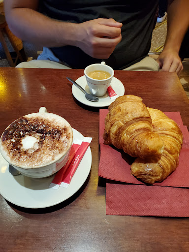 Right by our airbnb, we came for a late lunch after landing from Athens. Greeted by a friendly man who spoke some English. He showed us the daily menu and bless his heart tried to explain it in English. We tried to use as much Frnech as we knew and settled upon two daily specials with plum tarts for dessert. We left soooooo happy. The steak skewers where cooked perfectly. The sauce was incredible. And the frites were super cripsy and the jug of wine was super affordable....I only wanted more. Great first meal in Paris! We also came here for breakfast and got a cappucino and...