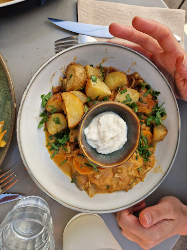 Read moreHet was even zoeken naar de ingang van Le Passage à Niveau die in een soort inrit door een schutting aan de straat ligt. Door rottend afval (ik herkende de lucht van composterende citrusschillen die ruiken naar babypoep, excusez le mot) stonk het daar zo vreselijk dat we dachten dat het daar niet kon zijn. Na wat heen en weer geloop toch maar door de meur heengelopen en toen in een charmant, rommelig postindustrieel tafereel beland pal aan de vroegere ringspoorlijn van Parijs. We waren moe van een intensieve dag Parijs en werden zonder reservering gastvrij ontvangen. We hebben genoten van een vegetarische hoofdgerecht en vegetarische maaltijdsalade en drankjes. Voor veganisten blijft het tobben in de culinaire topstad Parijs, die misschien lijdt aan een remmende voorsprong. Ook hier staan alleen een paar vegetarische gerechten op het menu. Mijn tijdige vondst van een steentje in mijn linzengerecht werd bezorgd en met excuses ontvangen. Gelukkig merkte ik een geen schade aan mijn gebit. Dat je linzen altijd moet controleren op de aanwezigheid van steentjes was nieuws voor het personeel. Maar zeker een leuke en vriendelijke plek met een...