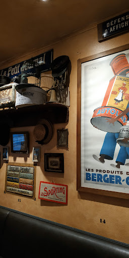 Parmi les nombreuses plaques publicitaires décoratives accrochées aux murs, deux en particulier ont retenu mon attention : celles de Banania et de Berger Grillon. Ces publicités renvoient à un imaginaire colonial français malaisant. Même si cela n’est sans doute pas intentionnel, je pense qu’il est important de réfléchir à ce que ces images véhiculent, et à leur impact potentiel sur la clientèle.