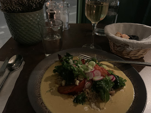 Read moreThis little corner restaurant is cozy and elegantly decorated. The tables have individual lights and live plants and the lighting is perfect. The menu is artistically designed with detailed descriptions and offers wine pairings for each dish. I chose the roasted sweet potato starter with a light white wine after the chef very kindly took time to explain why he believes in that combination. He was professionally attending his floor all evening, chatting with his customers and offering recommendations and information, and was a joy to interact with. I couldn’t quite believe it when I had my first bite. So much depth and flavor! Wow. Just incredible. Even the bread they put on the table is extra special, moist and flavorful. I had the squash curry and it was perfectly portioned, delicious with all the right texture. It was not spicy in the heat sense but spices are present and elevated with a gorgeous subtly within the sauce. That was lovely with a white wine as well. I concluded with the chocolate mousse and a glass of red which the chef suggested may be an elegant match and he was absolutely right. The mousse is perfectly sweetened. It just melts in your mouth -like a cloud, the chef mentioned- and wraps nicely around the crunch of the nuts. I was so very impressed and have already made plans to return to try another series of courses. This is most definitely a place to come out of your way for if you are a plant-based culinary...