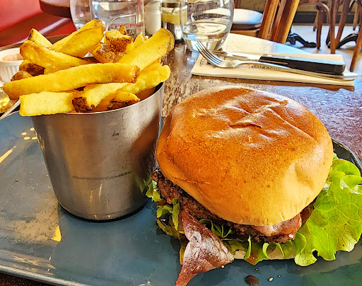 The croque had no bechamel, something I consider critical to separate a croque from an ordinary grilled cheese sandwich, and the bread was barely toasted. The onion soup had no layer of melted/toasted cheese on top - it appeared that they had thrown in some cubes of cheese before microwaving, and the cheese just remained in little globs. We ate them because we were hungry, not because they were any good. As we looked around, we realized that almost nobody else was eating, most were drinking and smoking on the terrace and using their laptops. So, it appears more of a neighborhood place to get drinks. A nearby table had a burger that looked really good.
