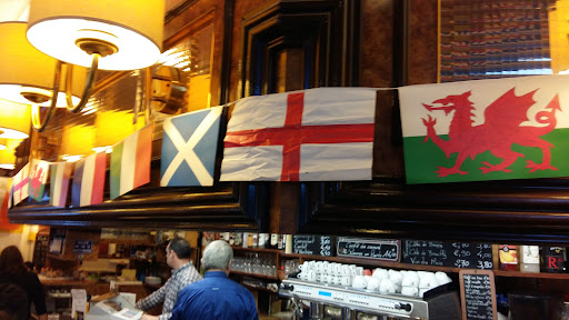 French bistro cuisine & live rugby on TV at a buzzing brasserie decorated with sports memorabilia.