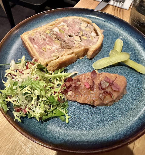 Read moreNice spot a few doors down from the Moulin Rouge with an affordable menu and excellent service. The food I am giving 4 stars only because our mains were so good - the starters were all over the place. The pork belly and steak mains - fantastic. The escargot - while decent in size, lacked flavor. I am a big escargot fan and order it a LOT. These were not good. The kaarage chicken - had good flavor but instead of being crispy was a bit soggy. The foie gras en croûte itself was just alright but the chutney it came with was pretty tasty. The white asparagus was a bit too mustard-y for me but my husband loved it. I’m giving this restaurant only 3 stars for ambience since we were seated upstairs, which was only a few tables and a bit dull with white walls and no street view or anything. It kind of seemed like “overflow seating”. This restaurant has so many 5 star reviews. Either they are mostly Americans going to the Moulin Rouge who really don't know how good French food can truly be, or my family ordered the wrong dishes. Overall, if you are going to the Moulin Rouge it would make a decent spot for a meal beforehand, but I wouldn’t seek this restaurant...