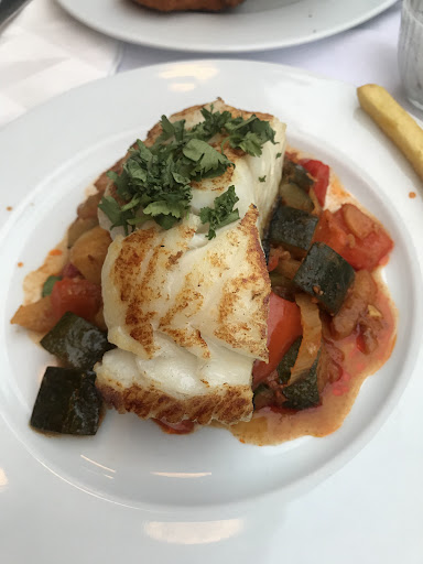 Read moreLocation has a great atmosphere and neighborhood was charming to sit outside and dine. We had dinner and our waitress was excellent and very attentive. She did not speak that much English but that did not deter her from taking our order correctly and efficiently. Food was good, I ordered the cod on top of ratatouille, fresh and great tasting dish. My husband ordered fish and chips, not the best but not the worst. The table next to ours someone ordered the duck confit over potatoes and it smelled divine, wish I had ordered that. For dessert I wanted the 3 cream puffs but they were out, waitress recommended the large cream puff which I ordered. It was a giant cream puff with ice cream and chocolate syrup all over, not really my top choice. The ice cream was decent but the rest I could’ve done with out. Overall decent food, great location, great service, and beautiful decor. Heaters outside can get a little too...