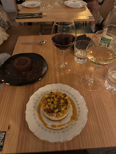 Les tapas et le fromage sont bons mais nous n’avons pas retrouvés certains produits énoncés dans l’assiette et manquaient de saveurs, en dehors du poulet qui était particulièrement savoureux et la sauce au miel excellente. J’ai beaucoup apprécié les noix et le confiture avec le fromage c’est plutôt rare ! Les prix sont globalement élevés par rapport à la prestation proposée et aux autres bars à vin de la rue.
