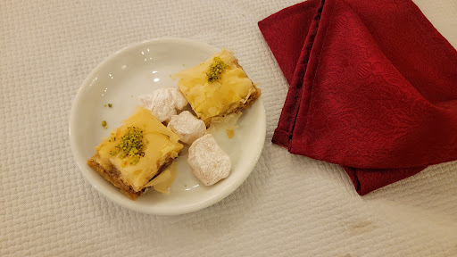 Le dessert : Baklavas Trois baklavas à la pistache : feuilletés croustillants, garnis d’une pâte de pistache fondante et sucrée, le tout nappé de sirop. La texture est parfaite c’était très bon et c’était une excellente façon de conclure le repas, très gourmand et raffiné.