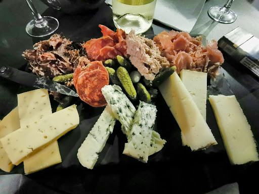 Industrial-chic wine bar with snacks like charcuterie & cheese, plus sidewalk tables.