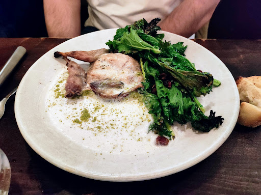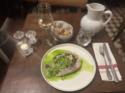 The highlight of the meal for me was the dessert: my choice of three cheeses from a plate of maybe eight options. The one at 12 o’clock was having its moment. The one at 4 added the perfect punch. And the chèvre at 7, 8, 9 added a more firm taste. The staff were incredible: energetic, knowledgeable, kind, friendly, even. The wine suggestions were spot on, as well as for the cheese. The main dish however was simply okay. No flavor grabbed me to say “omg” like when I was experiencing the cheese. The beans were not quite done. The greens were the best part. Perhaps the vegetarian dish would have been a better choice for my tastes. Regardless of what you choose, this restaurant will welcome you...