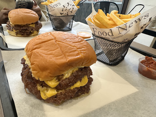 Read moreI had to eat here since every where else was closed when I got to the nearby hotel I was staying in. The reviews were great. It was the first time I tried this type of burger (three thin layers of burger meat on top of each other but the bun was so small and thin that it was impossible to eat it without making a mess. The French fries were great though! The burger only tasted okay, nothing...