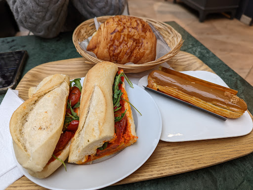 Read moreA very cute Boulangerie that you should definitely visit! The location is very close to metro and bus stations. The food was delicious, the coffee very good as well. The service is fast and the staff very polite and kind. We had a sandwich with salmon, a sandwich with chicken, pain au chocolat and 2 cafe au lait. Paid about 21...