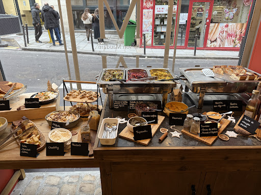 Le lieu est sympa, l'ambiance cosy, c'est petit (6/7 tables). Nous avons réglé 115€ pour 3, avec 1 chocolat chaud et 2 cafés au lait, soit 38€/personne. La déception vient clairement du rapport quantité/prix et de la trop faible variété du buffet. Le choix est fait d'un buffet et de 2 compléments servis à table : une petite assiette charcuterie/fromage et des oeufs brouillés cuits dans la meule de parmesan, qui sont bons. Nous sommes 3, il y avait 2 choix de fromages coupés très petits dans l'assiette, mais pas chacun en 3 ; sur demande, la serveuse nous en a donc rapporté un 3ème, et la charcuterie est en portion infime. Clairement, l'option fromage/charcuterie classique devrait être évidemment ajoutée en libre service à l'offre buffet à volonté. Le buffet reste bien trop sommaire pour le tarif proposé : 3 options sucrées sont redondantes car les 3 à base de crème fouettée donc si vous n'aimez pas, reste très très peu d'options sucrées le reste du sucré est composé d'un choix de trop petit morceaux coupés (1 cookie, cakes, 1 tarte). des pancakes à améliorer (très épais et non entretenus tièdes) 2 options quiches salées (lorraine et légume, correctes), et 3 salades qui sont bonnes et originales (base lentilles, boulgour par ex) Et c'est tout. Aucune option de plat salé chaud, ou de viennoiseries, de saumon, de fromages, de yaourts, ou autre classique attendu pour un brunch buffet. Je joins une photo. Les autres présentations sont des confitures ou tartinables, mais rien de consistant ne vient augmenter la varité espérée du buffet. Le café basique, l'eau et la citronnade sont en libre service. Pas de jus de fruits. Le service était courtois, l'ambiance générale bonne, il serait facile de vite remédier au rapport qualité/prix/variété pour permettre à ce lieu de devenir alors une bonne...