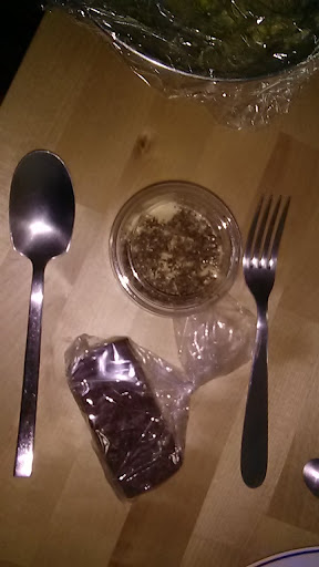 Pour ce prix là, nous nous attendions à un certains niveau, mais grande déception: le pain pita bon mais un peu sec (cuit le matin?) le "Pita Burrata crémeuse & Aubergines marinées" était bon mais pratiquement aucune aubergine dans le sandwich le Pita à composer avec "Pommes de terre rôties & Maï" et "Tofu" n'avait pratiquement aucune patate et surabondance de tofu, donnant un goût trop sucré au sandwich le hummus bon mais quantité ridicule pour 4 euros (voir photo avec ustensile pour comparaison) le brownie, il y a de l'idée avec les graines de sésames, mais on a l'impression que le chocolat utilisé dans la recette n'est que de la poudre de chocolat non sucrée, donnant au final un dessert non équilibré, farineux et le côté amer trop prononcé, sans le côté fondant et le sucré d'un chocolat. Aussi taille ridicule pour 4 euros (2 sur 5cm...)