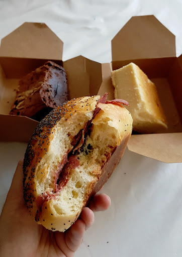 Leur babka chocolat est bien beurrée, bien garnie en chocolat noisettes avec des éclats. Le brownie halva tehina est un pur régal. Pas sec, tendre, pas écœurant, avec cette pâte de sésame qui vraiment renouvelle le brownie. J'ai envie que tous les brownies soient au sésame maintenant ! Le keskir (cheesecake ashkénaze) est lui moins réussi car sec et vraiment bien lourd. J'aurais apprécié une version plus légère sans pour autant devenir le gâteau formage blanc de l'est de la France. Le Pletzel pastrami est bien moelleux, humide. L'oignon dessus n'est pas gadget et convient très bien au pastrami, pickles et moutarde au miel. Il est d'ailleurs plus rempli que le laisse voir ma photo, juste mal reparti. Hâte de tester le reste !