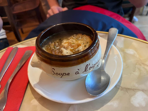 The restaurant offers lunch sets which are really affordable and worth the money (18€ for starter/dessert + main; 23€ for starter + main + dessert). We ordered both foie gras dishes and the french onion soup for starters, where the former were very good while the latter was lacking compared to other places in our opinion. Next, we had the beef bourguignon (beef stew), which came with stretchy mashed potato, and bourguignon burger (beef burger), which came with very crispy fries, for our mains. They were big portions and were absolutely delicious. Lastly was the dessert: café gourmand, which consisted of a coffee, ice cream scoop, and chocolate mousse. Despite our fullness from the starters and mains, we finished the dessert as it was just that good. Overall, we would recommend everything we got except the onion soup, as we personally preferred the taste from other restaurants.