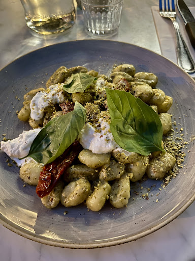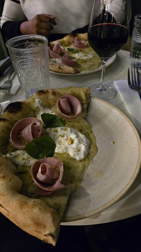 We decided to share a pizza. The combination of basil, pistachio, and cream made the pizza exceptionally delectable. The ham, artfully rolled into a rose, added an aesthetic touch to the dish, making it visually appealing and appetizing. However, we encountered a minor inconvenience with the blunt knives, which made it challenging to cut the pizza slices. Consequently, we reluctantly abandoned our attempts to cut the crust.