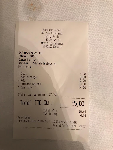 Read moreModern decor, menu a bit limited and a bit pricey. Be prepared to pay for papadums too. Sweets very underwhelming for the price. Much prefer Ashiana in the Neuilly area. This is not, as the owner suggests, a fake review. We were in Paris for the Arc De Triomphe racing, and were staying at the Paris Neuilly hotel. We walked (a long way),to the Mayfair, on Saturday evening, without a reservation, as we like Indian food, and wanted a change from the Ashiana, which was very close to our hotel, and where we had dined (twice) the previous year, and did so again the following day. At the Mayfair, we sat at a table for two, inside and to the left, against the wall, on a table for two. For continuity, the decor is mostly plain, white, but clean, and the restaurant was half empty, and no music was playing. The downstairs toilets were immaculately clean, and nicely decorated. I enjoyed the food, but am disappointed the management believe my review is fake, which is disappointing, to say the least. I hardly ever give a five star review, (always room for improvement), but as the Ashiana got a 4 from me, and the Mayfair, whilst more upmarket, in my opinion wasn't as an enjoyable experience overall, hence the 3 star I gave. I have no axe to grind with the Mayfair, the food was nice, but not as plentiful as I would have liked, and the service was good. It wasn't a bad experience, it just wasn't as enjoyable as I was expecting it to be, based on the reviews it has. It's not a bad restaurant, and at the end of the day, it's...