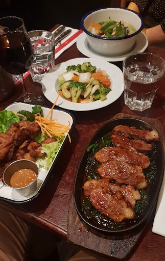 71 balles pour 2 entrées , un plat (la bouffe est pas ouf hein...) et 2 bieres singha dont une renversée avec la petite odeur de brulé juste au dessus de toi parce que le serveur essaye de souffler sur l'abat jour de la lampe qui prend feu.