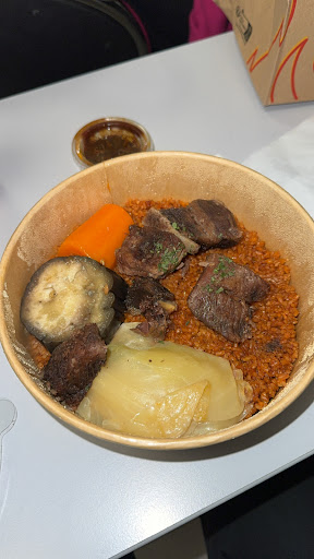 Je commande un mafé au poulet, on me fait attendre un bon quart d'heure avant de me dire qu'il n'y a pas de poulet. J'accepte qu'ils le remplassent par du boeuf (j'ai déjà payé et j'ai deja tellement attendu que je ne vois pas quel choix j'ai). J'attends. J'attends. J'attends. J'attends. Il fait plus de trente degrés, la salle est très mal climatisée. J'attends. Ah on me dit que la commande arrive "tout de suite". J'attends. J'attends. On me dit que cette fois c'est vrai elle arrive "tout de suite". J'attends. J'attends. Je me plains pour la première fois en 40 minutes. La serveuse me remet la commande sans un regard, sans un mot d'excuse, sans meme un au revoir.