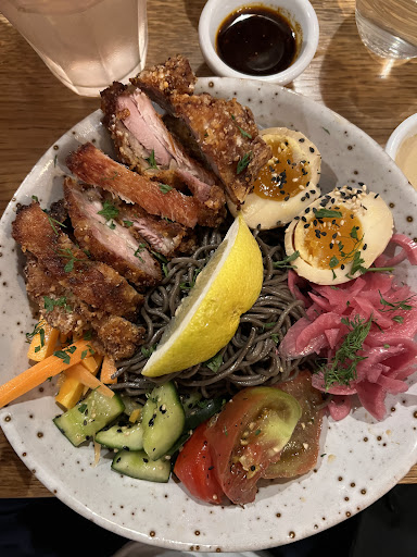 The soba noodles were good. The veggies were a nice touch. I preferred the mushrooms to the chicken. The space was...