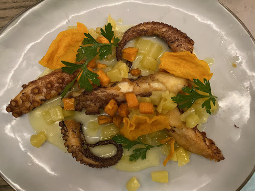 Food: We had the following appetizer: Poulpe poêlé sur crème de pommes de terre pastas: (1) BUSIATE, CARBONARA DI SCAMPI CON STRACCIETTI DI MELANZANE, (2) MEZZELUNE FARCITE CON BURRATA E MANDORLE CON SALSA DI DATTERINO ROSSO E GIALLO FRESCO, MENTA desert: (1) IL NOSTRO PROFITEROLE, (2) PANNA COTTA AL MANDARINO DI SICILIA, CARAMELLLO