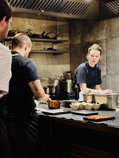 L'accueil est parfait, tout comme le service : pro, mais sympa, accessible, pas guindé, adapté à une population jeune qui n'a peut-être pas tous les codes (c'est ce que j'ai ressenti) et qui n'a pas envie de l'atmosphère feutrée qu'on peut imaginer des étoilés. La déco est cohérente avec cela, d'ailleurs : il y'a quelque chose de brut, sans superflu, mais une finesse qui dit qu'ici, on pense les détails. Et finalement, elle a le charme, le mérite de se faire oublier, cette déco, dès que les assiettes commencent à défiler.