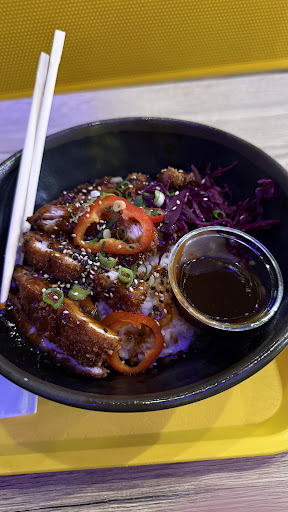 The Katsu, Cabbage, Rice bowl with the sauce in the little dish for dipping...