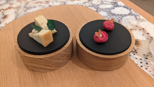 What We Didn't Like: We didn't much enjoy the wine pairing, three glasses for 65 euros: a sake, a champagne, and a white, which did not pair well with the dishes. Not recommended and expensive. But let's come to the most painful part: most of the dishes, excluding sauces, butter, and desserts, consisted almost solely of vegetables. There's nothing wrong with a vegan menu (I've been vegan for a long time), but it's important to know how to introduce protein-rich, delicious, and/or fatty elements. Or at least some grains. Vegetarian doesn't mean vegetable-only. If, as in our case, a Michelin-starred restaurant offers absolutely no proteins or grains in a menu, that's odd. And even if one wants to offer a vegetable menu, the vegetables need to be well-prepared. In fact, the main dishes we had were mainly raw vegetables or cooked very simply. Almost no fried, roasted, smoked elements, etc. There was a significant lack of the surprise and adventurous pairings expected in a Michelin-starred restaurant. The worst dish was variously colored carrots cooked by steaming/boiling with lemon, ginger, onions, and a sauce. The dish was unbalanced towards the acidic side, and a bit bland. The carrot was too dominant and not interesting in flavor. Next came a revisited autumn minestrone. This dish was made of typical minestrone vegetables, well presented with potato sauce and tarragon sauce. Unfortunately, the cooking technique for the vegetables seemed the same, all boiled/steamed, with rather ordinary flavors and overpowering sauces. It lacked varying textures, exciting flavors, and creativity. No proteins or legumes in sight. The same was true for the pre-dessert, which was supposed to contain eggplant and basil ice cream. The flavors were not enhanced, the ice cream tasted like mint, and the eggplant was bland. Moreover, if the pre-dessert is meant to connect the main dishes with the dessert, basil and eggplant didn't seem in season, unlike the autumn vegetables used in the previous dishes. It seemed, in short, a limited menu, out of the kitchen's comfort zone, lacking in flavors and textures. Overall, the dining experience did not bring the typical joy associated with a Michelin-starred meal. A pity.